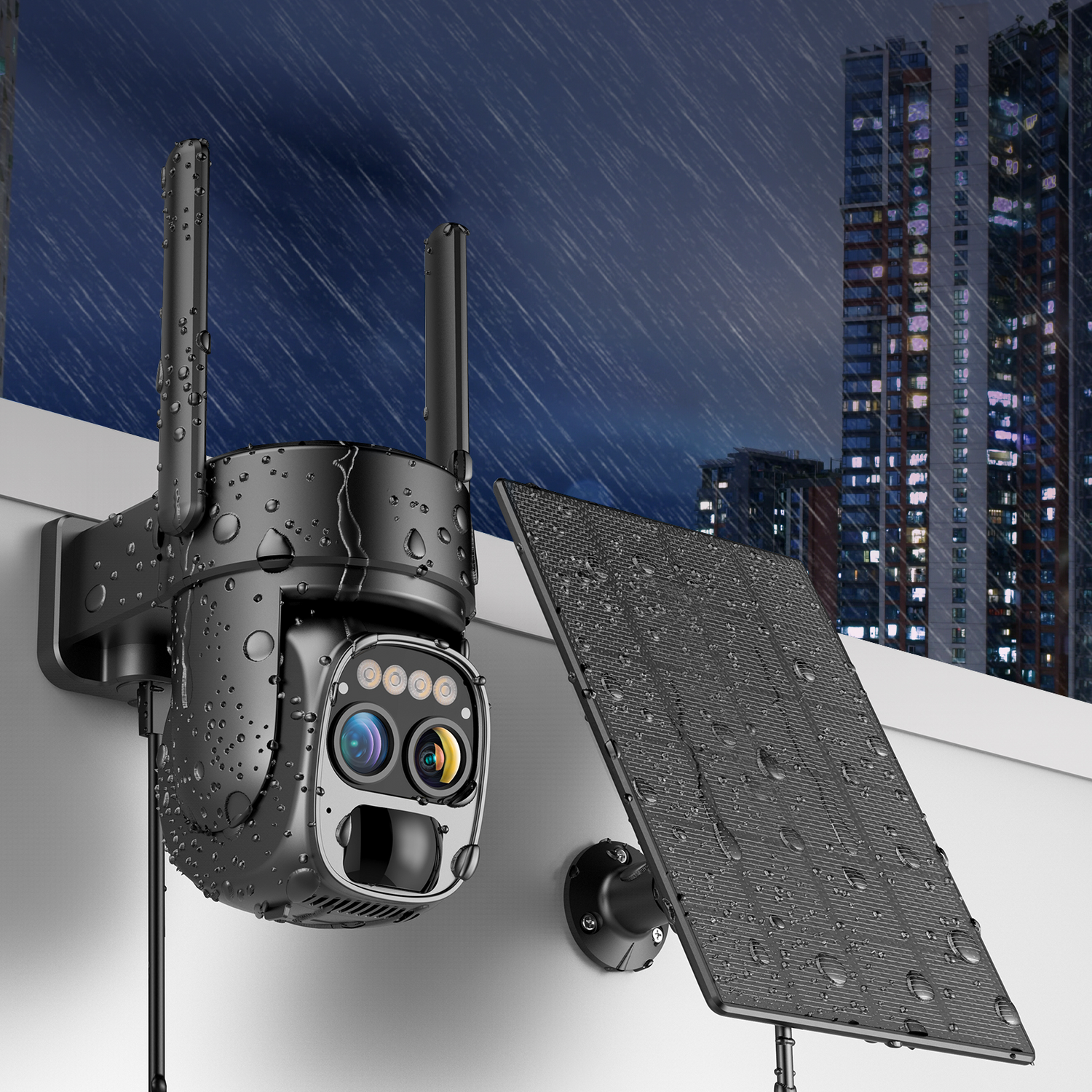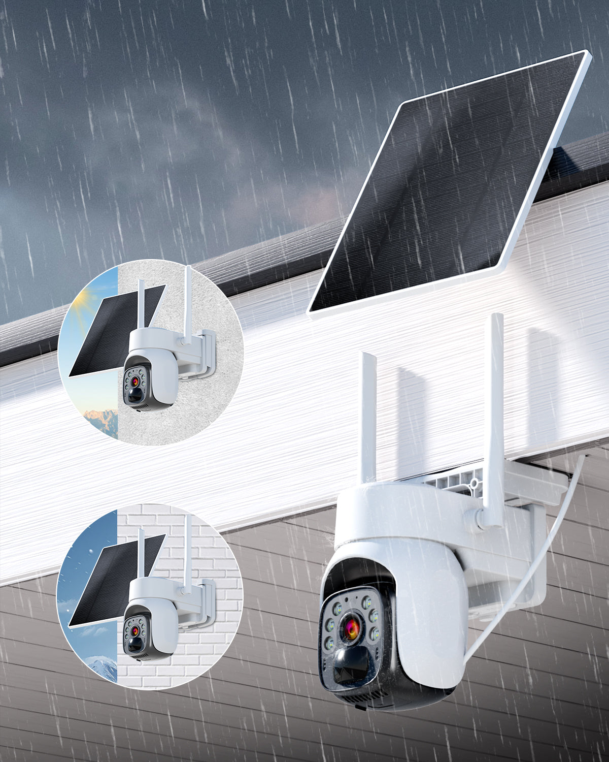 This solar-powered, waterproof camera features dual lenses, IP66-rated all-weather durability, and is perfect for indoor or outdoor use year-round.